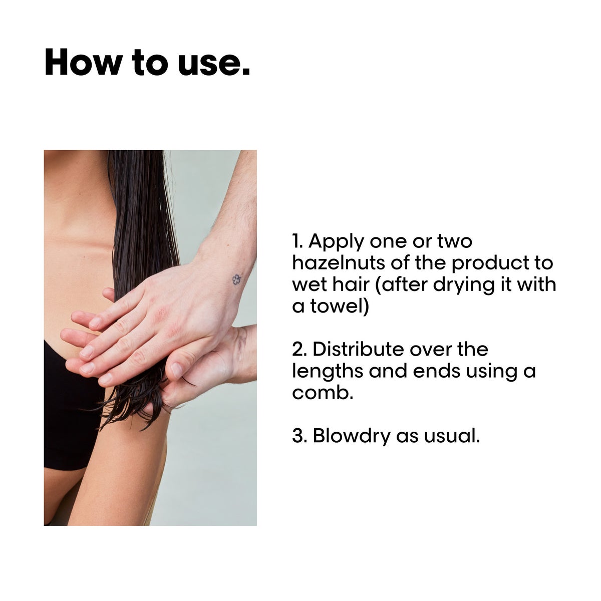 Levitä 1-2 hasselpähkinän kokoista annosta pestyihin ja pyyhe kuivattuihin hiuksiin. Levitä tasaisesti pituuksiin ja latvoihin.